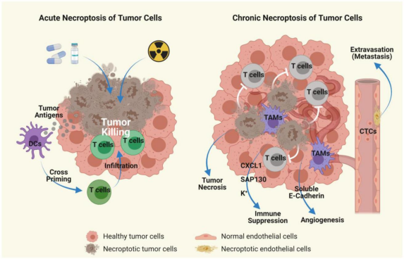在晚期肿瘤中,坏死因子途径通过调节淋巴细胞和肿瘤相关巨噬细胞(TAMs)产生免疫抑制肿瘤微环境,从而促进肿瘤生长。癌细胞坏死是肿瘤坏死的主要原因,肿瘤坏死与免疫抑制、血管生成和转移的增加有关。同时,由肿瘤细胞分泌的死亡受体配体触发的坏死性凋亡可能促进循环肿瘤细胞(CTC)的外渗。