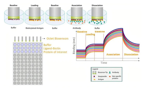 原理:是一种无标记(Label-free)光学生物传感技术,用于实时监测分析生物分子相互作用,并对其结合强度和动力学进行量化分析。与SPR技术不同的是,BLI技术中不使用金属芯片,而是利用生物传感器。将配体偶联在传感器的末端,浸入样品中来捕获分析物。