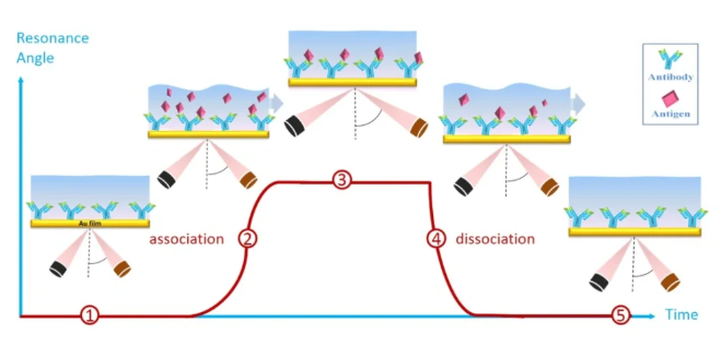 原理:在芯片表面固定一层生物分子识别膜,然后将待测样品流过芯片表面,若样品中有能够与芯片表面的生物分子识别膜相互作用的分子,会引起金膜表面折射率变化,最终导致SPR角变化,通过监测SPR的角度变化,获得被分析物的浓度、亲和力、动力学常数和特异性等。