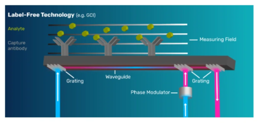 原理:基于波导干涉技术(另一种无标记的光学分析方法),可以实时监测和表征分子相互作用,并确定动力学速率参数、亲和常数以及与固定配体相互作用的分析物分子的浓度。